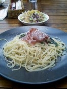 昼食:サーモンのパスタ大盛りとなんとかマキアート